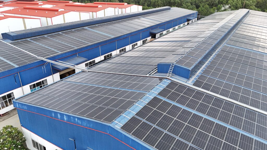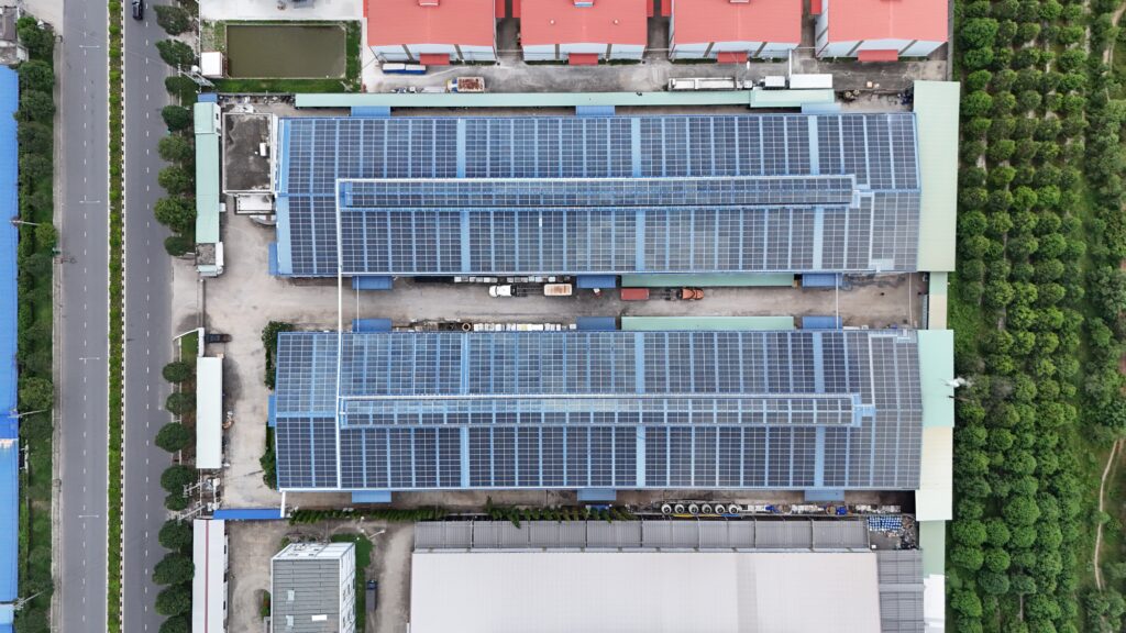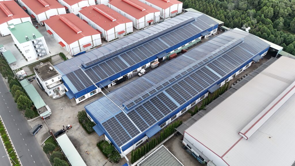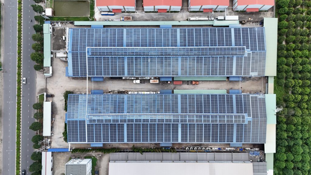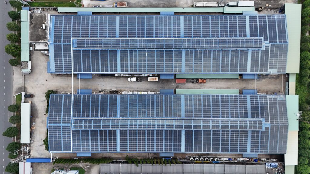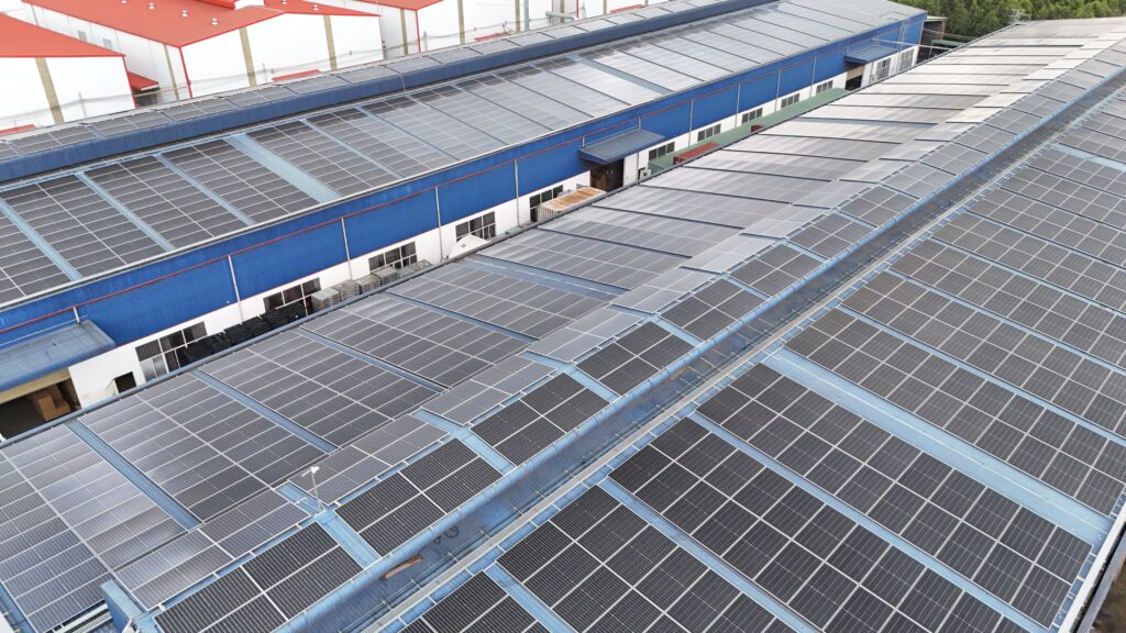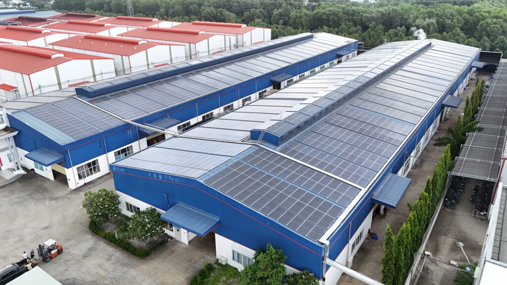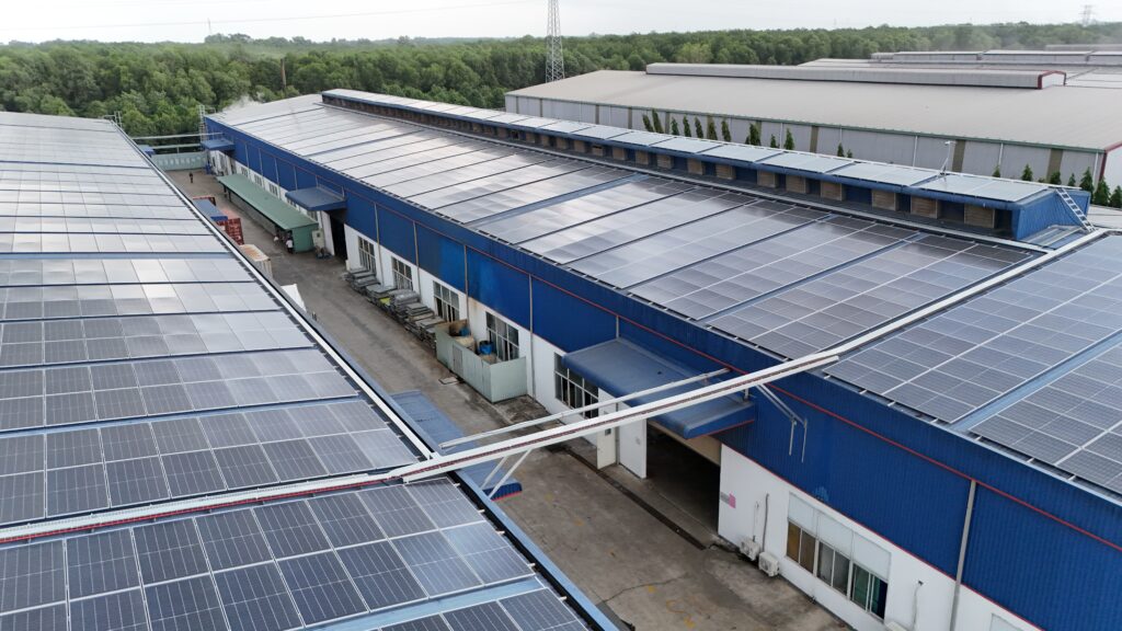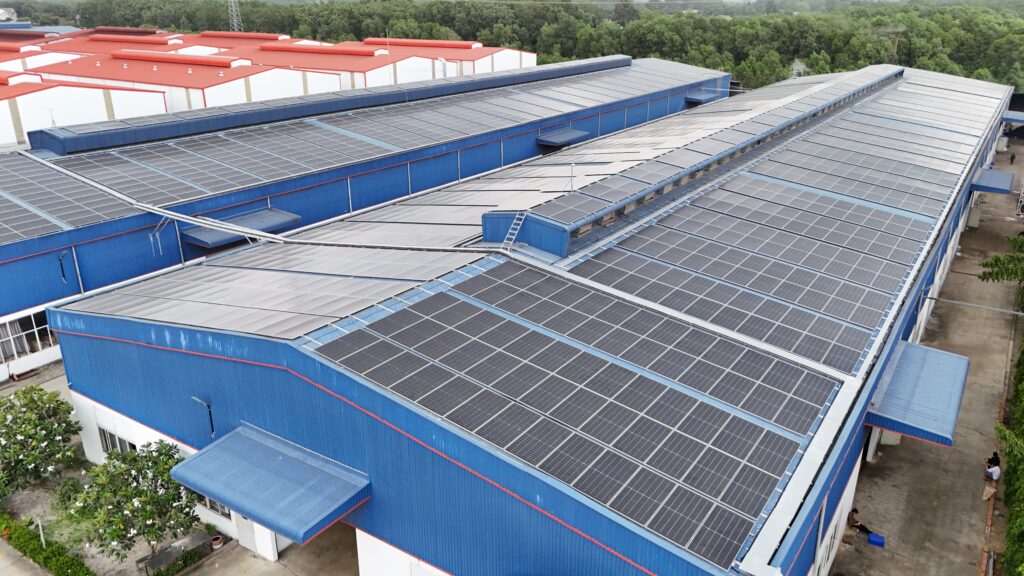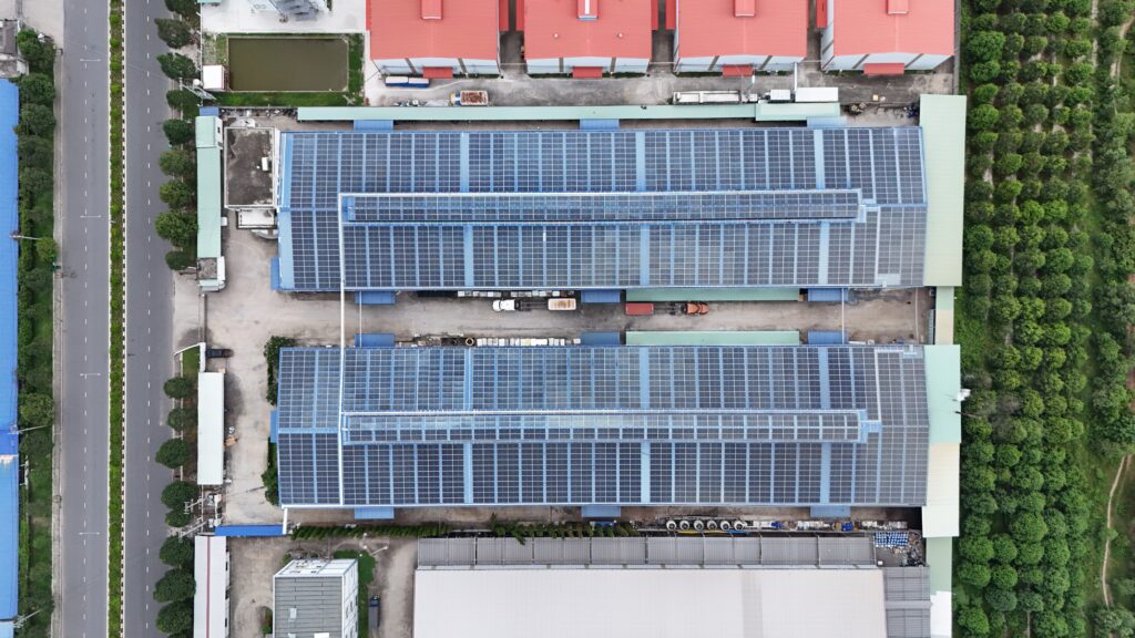 Nâng cao hiệu quả sản xuất và giảm chi phí vận hành với Hệ thống Điện mặt trời Áp mái Công nghiệp. Hình ảnh ấn tượng này cho thấy dự án điện mặt trời quy mô lớn được triển khai trên mái các nhà xưởng, tận dụng tối đa không gian rộng lớn để tạo ra nguồn năng lượng khổng lồ. Việc lắp đặt điện mặt trời giúp các doanh nghiệp công nghiệp giảm đáng kể chi phí điện năng, đặc biệt trong giờ cao điểm, đồng thời thể hiện cam kết mạnh mẽ đối với phát triển bền vững và giảm thiểu dấu chân carbon. Đây là giải pháp đầu tư chiến lược, mang lại lợi ích kinh tế lâu dài và nâng cao hình ảnh “xanh” của thương hiệu trên thị trường. Hãy chuyển đổi sang năng lượng mặt trời ngay hôm nay để tối ưu hóa hoạt động sản xuất và bảo vệ môi trường.