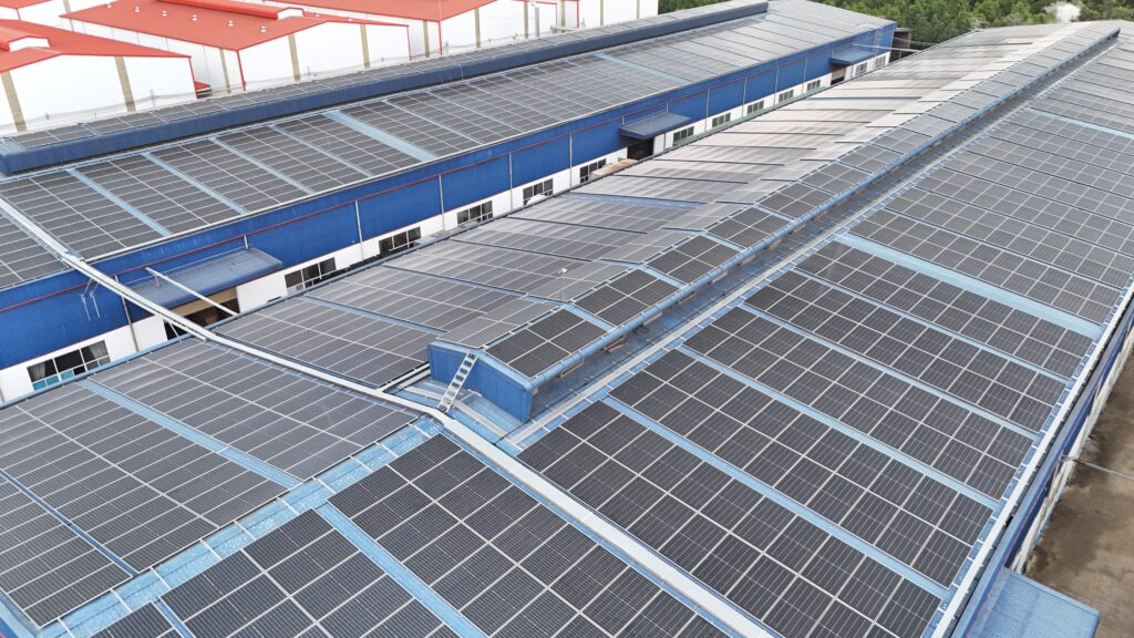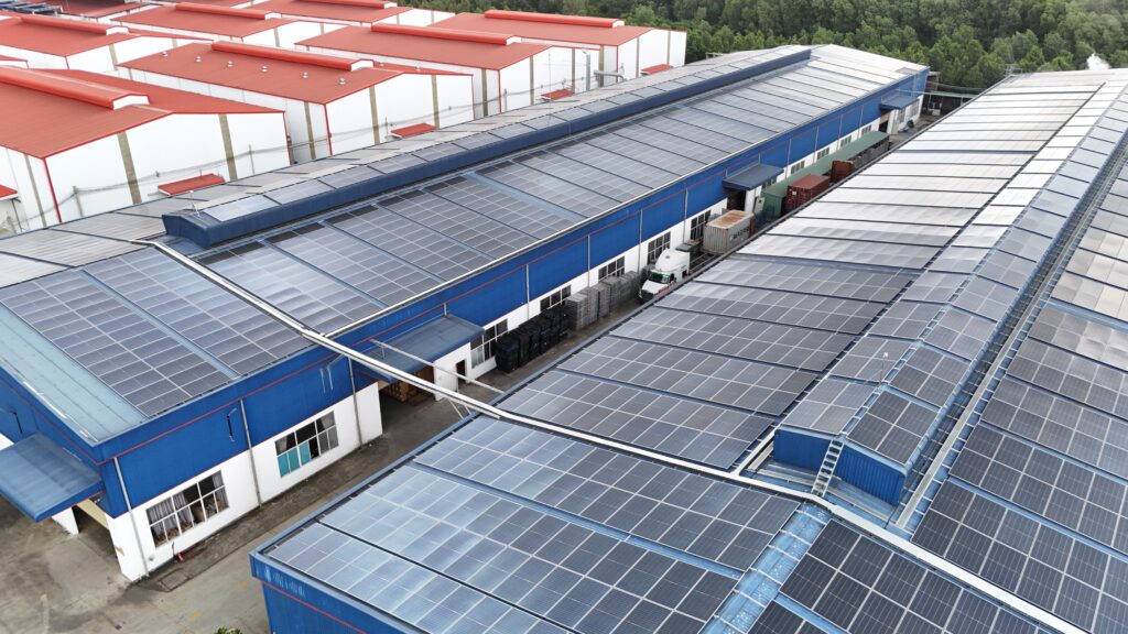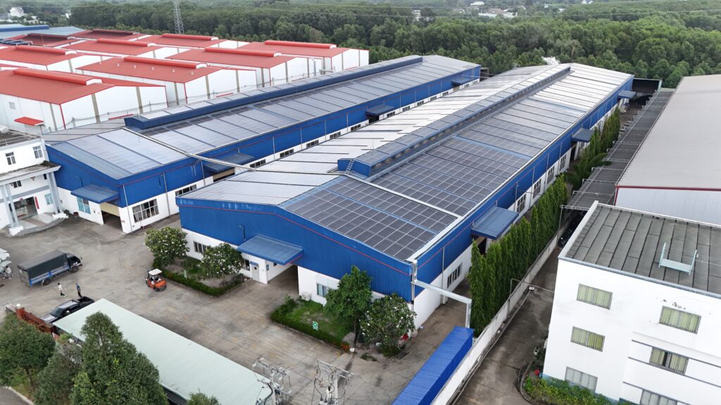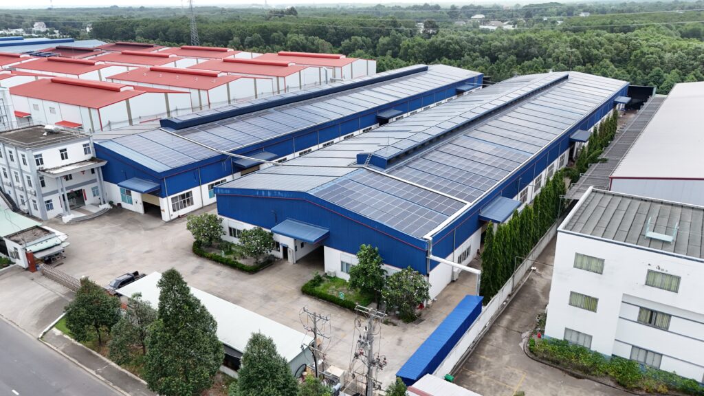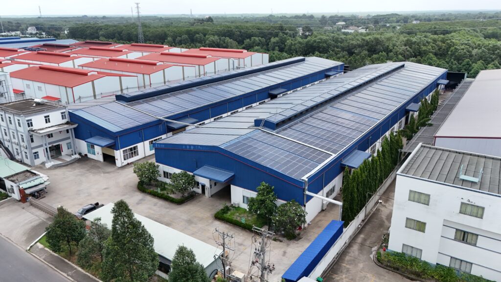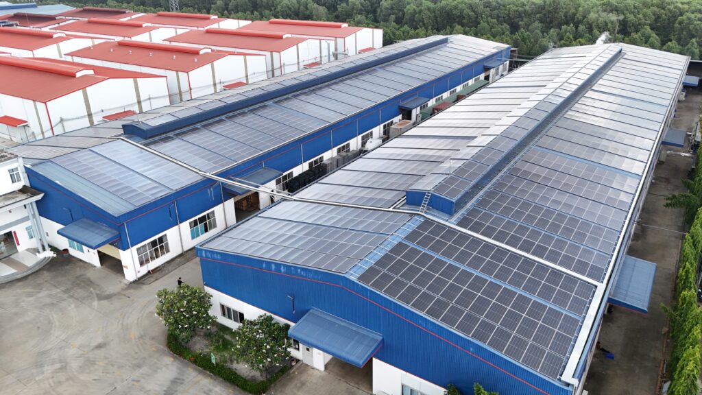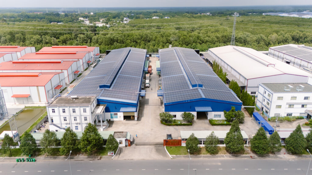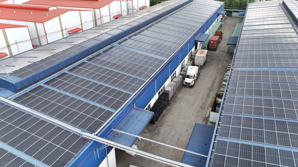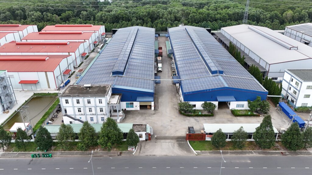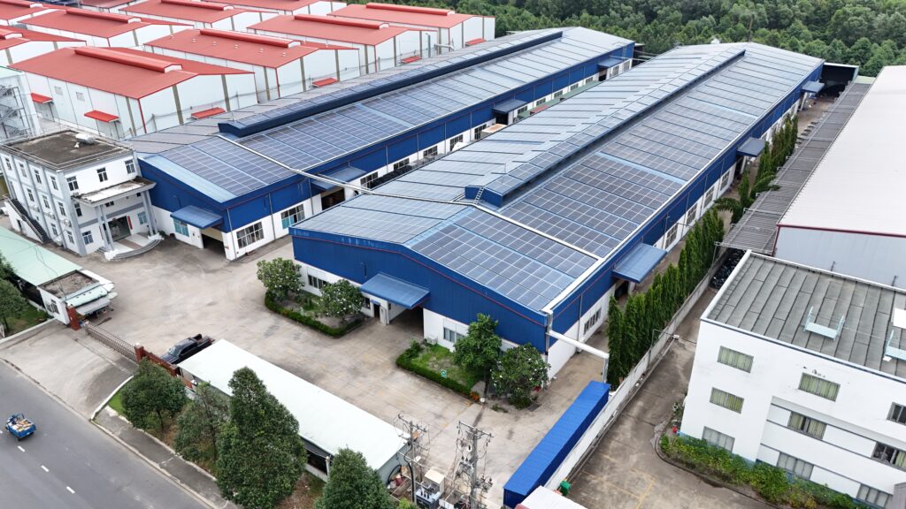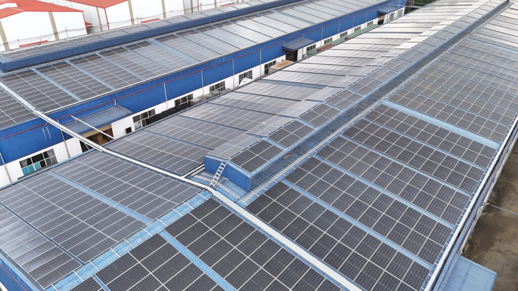 Nâng cao hiệu quả sản xuất và giảm chi phí vận hành với Hệ thống Điện mặt trời Áp mái Công nghiệp. Hình ảnh ấn tượng này cho thấy dự án điện mặt trời quy mô lớn được triển khai trên mái các nhà xưởng, tận dụng tối đa không gian rộng lớn để tạo ra nguồn năng lượng khổng lồ. Việc lắp đặt điện mặt trời giúp các doanh nghiệp công nghiệp giảm đáng kể chi phí điện năng, đặc biệt trong giờ cao điểm, đồng thời thể hiện cam kết mạnh mẽ đối với phát triển bền vững và giảm thiểu dấu chân carbon. Đây là giải pháp đầu tư chiến lược, mang lại lợi ích kinh tế lâu dài và nâng cao hình ảnh “xanh” của thương hiệu trên thị trường. Hãy chuyển đổi sang năng lượng mặt trời ngay hôm nay để tối ưu hóa hoạt động sản xuất và bảo vệ môi trường.