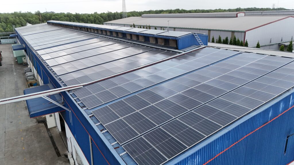 Giải pháp Điện mặt trời Công nghiệp Hiệu suất cao – Tối ưu hóa nguồn lực cho Doanh nghiệp của bạn. Hình ảnh này minh họa chi tiết hệ thống pin mặt trời được sắp xếp dày đặc và đồng bộ trên diện tích mái nhà xưởng rộng lớn, cho thấy tiềm năng khai thác năng lượng khổng lồ. Việc lắp đặt chuyên nghiệp, tận dụng từng mét vuông mái tôn, đảm bảo hệ thống đạt công suất tối đa để cung cấp nguồn điện dồi dào, ổn định cho hoạt động sản xuất. Đây không chỉ là giải pháp tiết kiệm chi phí điện năng hàng tháng mà còn là bước đi chiến lược giúp các doanh nghiệp lớn đạt được các mục tiêu ESG (Môi trường, Xã hội và Quản trị), nâng cao khả năng cạnh tranh trong chuỗi cung ứng toàn cầu. Đầu tư vào điện mặt trời áp mái công nghiệp chính là đầu tư vào sự phát triển bền vững và lợi nhuận lâu dài.